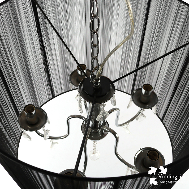 Prachtige moderne hanglamp bestaande uit een kroonluchter met kristallen, daar omheen zit een kap die bestaat uit gespannen zwarte draadjes.