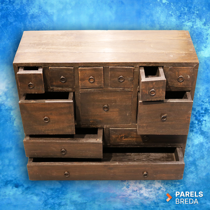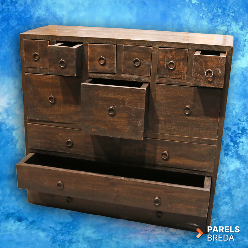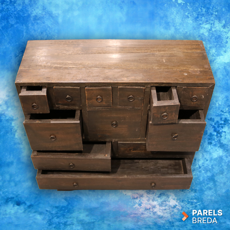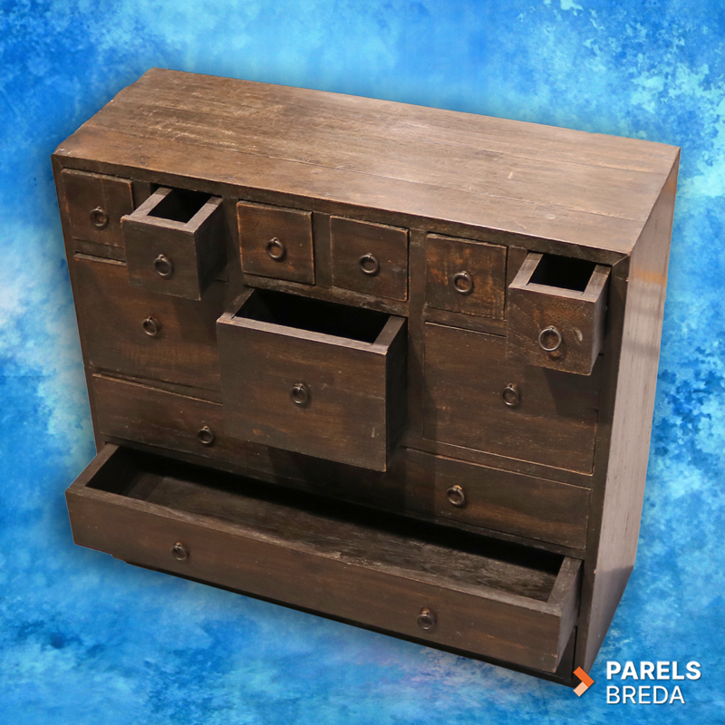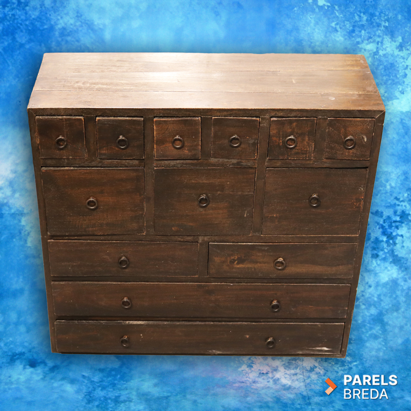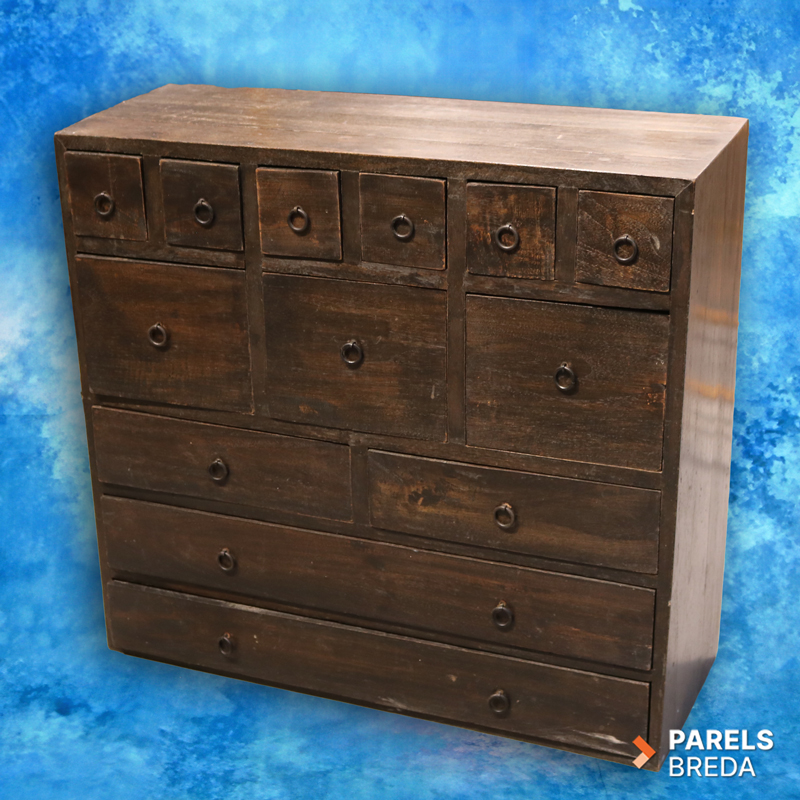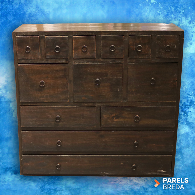 Deze mooie houten ladekast is vervaardigd uit massief hout en heeft een donker afgewerkte uitstraling. Het meubel is ontworpen met een speelse indeling van kleine, middelgrote en brede lades, waardoor het geschikt is voor het opbergen van uiteenlopende items. Het houtwerk toont lichte gebruikssporen die passen bij de leeftijd en het eerdere gebruik van het meubel. De kast heeft een stevige constructie en een robuuste uitstraling die goed tot zijn recht komt in verschillende interieurs. Een mooi stuk voor wie op zoek is naar karaktervol tweedehands hout.