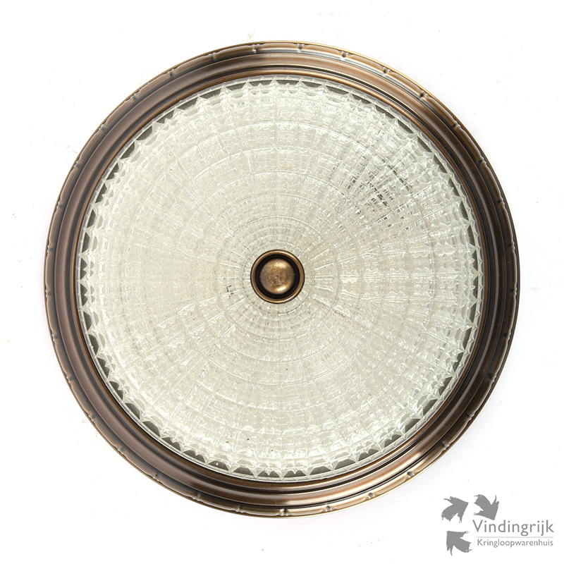 Mooie klassieke plafonnière in goede staat. De vintage lamp heeft een glazen kap met fraaie patronen in reliëf.