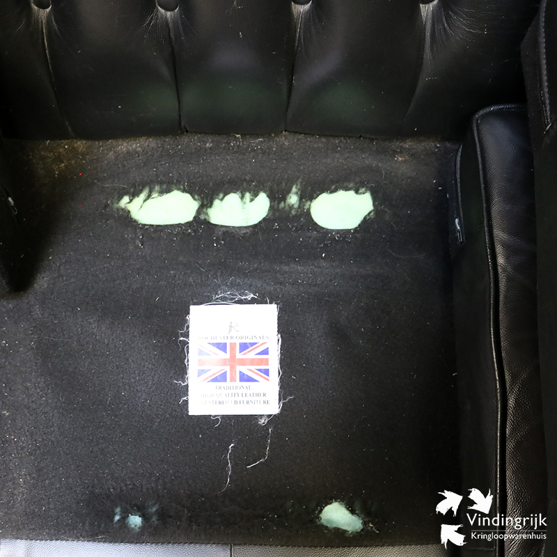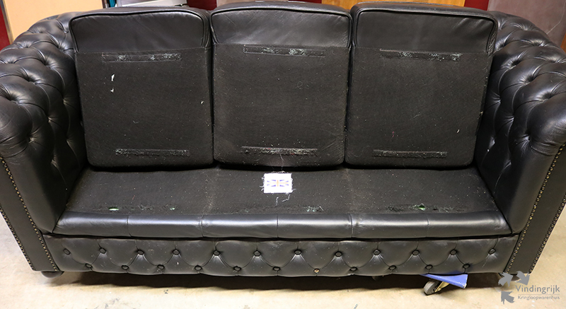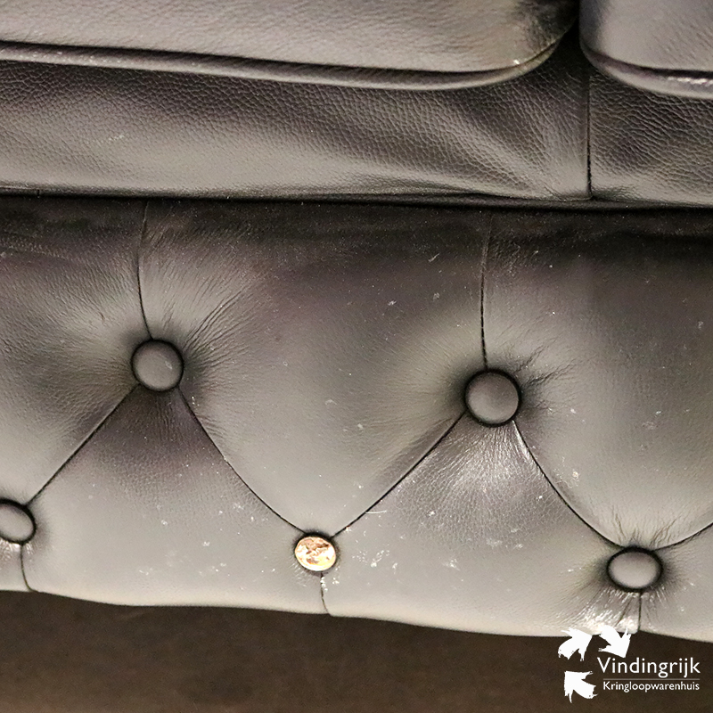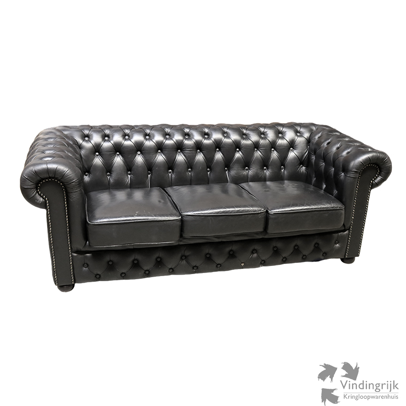 Deze bank uit Engeland is uitgevoerd in zwart leder en biedt plaats aan 3 personen.