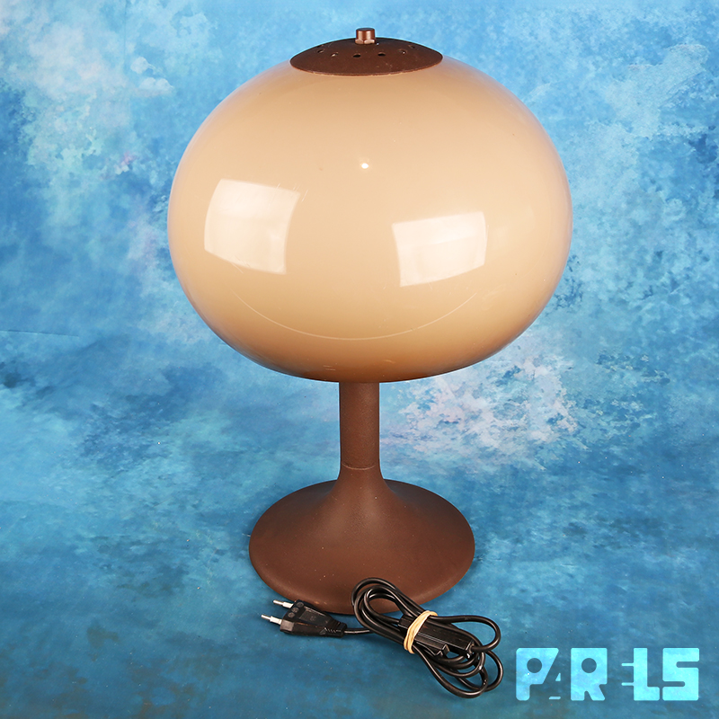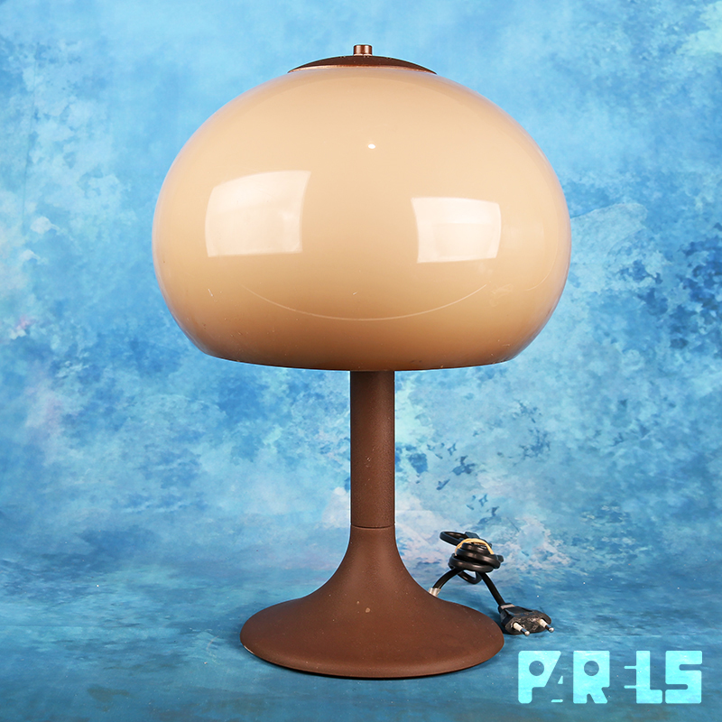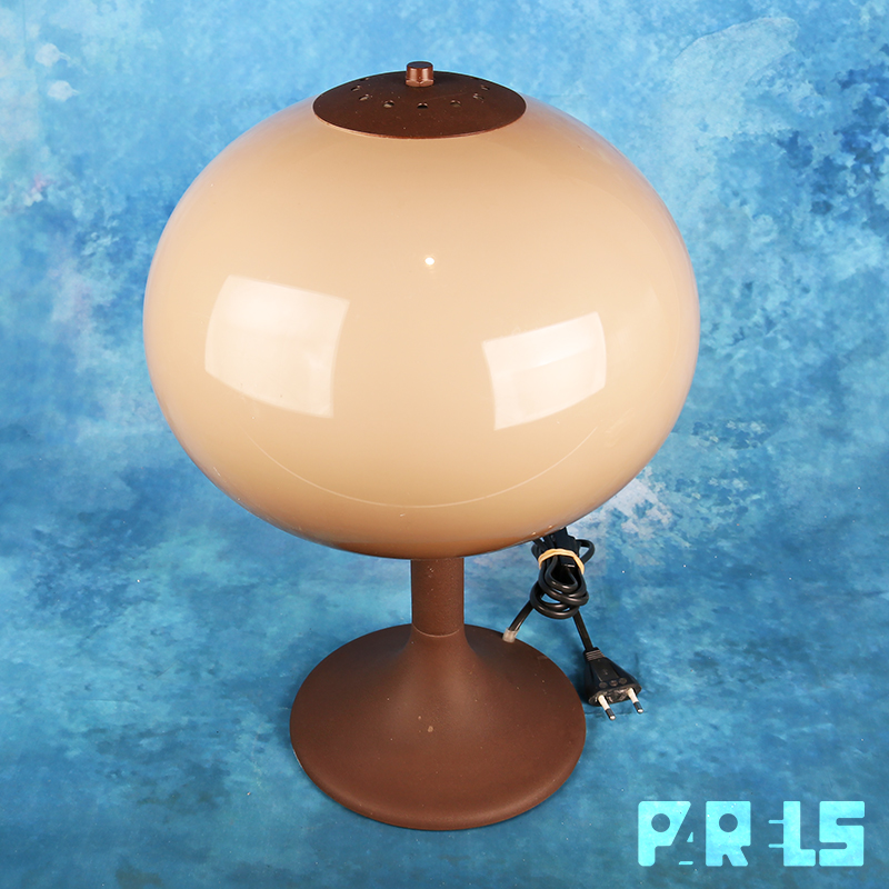Vintage space age mushroom tafellamp, gemaakt in de jaren ’70 door de bekende firma Dijkstra te Haarlem, Holland. De lamp heeft een bolvormige kap van beige plexiglas, welke een zeer warme gloed geeft, en een gepoedercoate metalen basis.