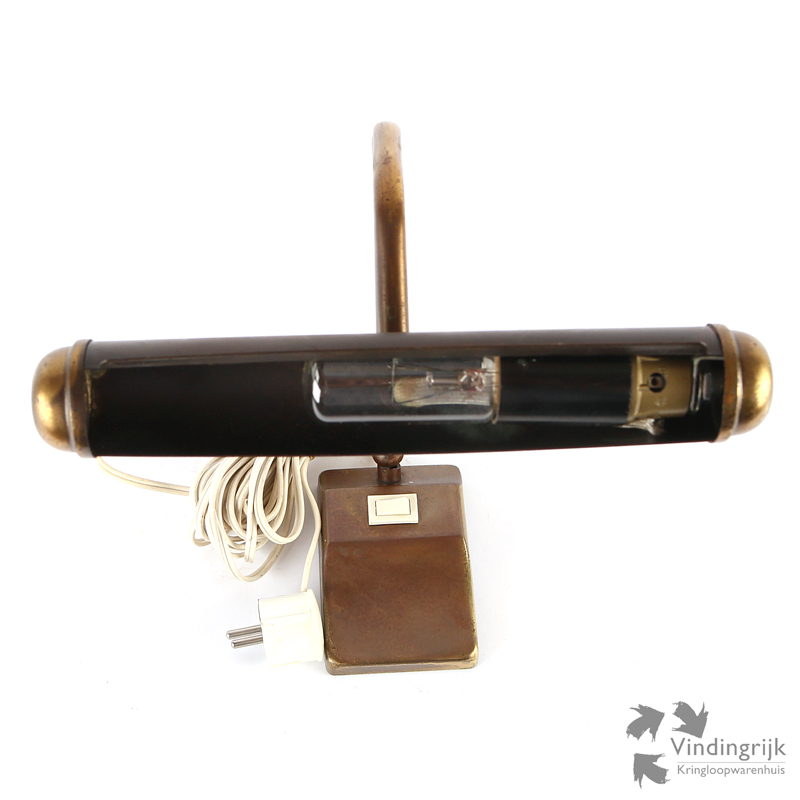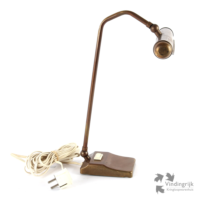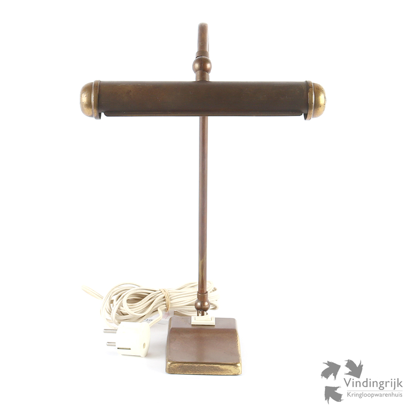 Vintage lamp voor op de piano om zo het notenschrift beter te kunnen lezen. De lamp van koper met verzwaarde voet heeft twee kogelgewrichten om het licht precies te kunnen richten. Ook geschikt als bureaulamp.