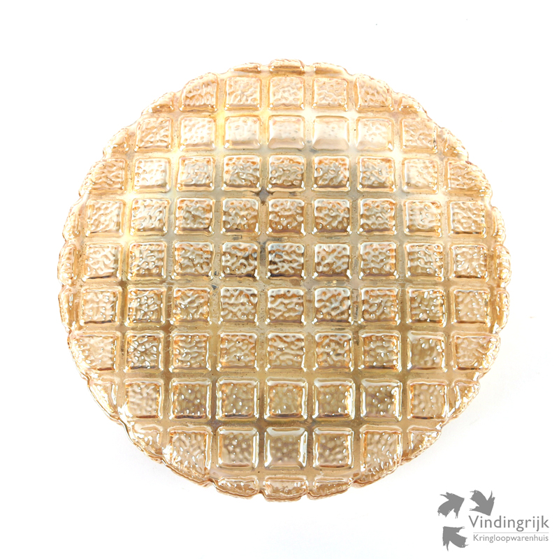 Vintage ronde glazen plafonnière met diverse vormen in reliëf.