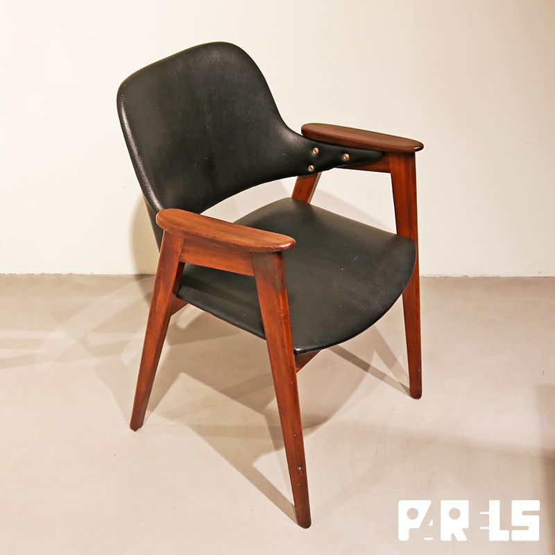 De degelijke teakhouten stoel met originele zwarte skai bekleding is nog in nette staat met slechts lichte gebruikssporen.