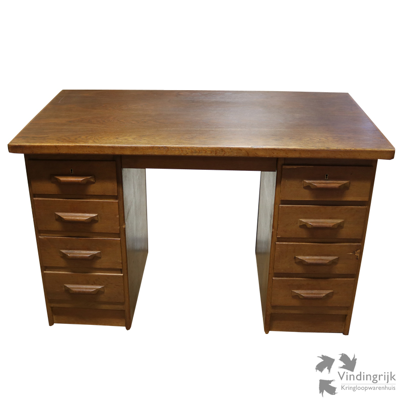 Klassiek houten bureau met aan beide zijden 4 lades. De twee sleutels zijn aanwezig.