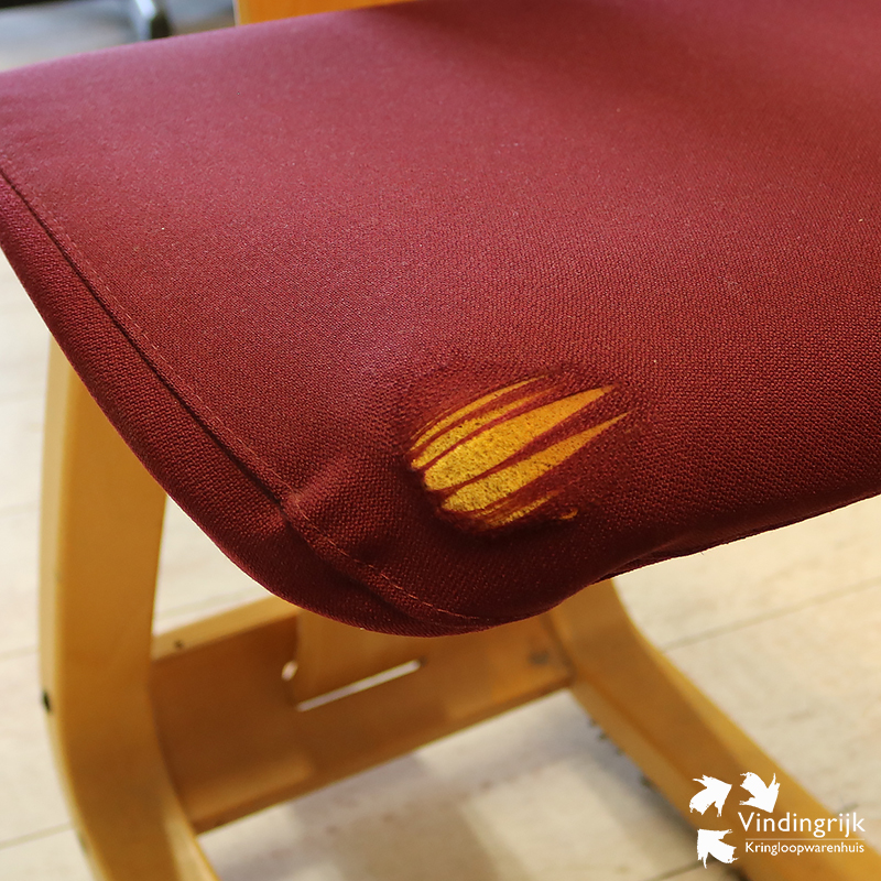 Bij de zitting is de stof beschadigd (zie foto), maar voor het overige is de stoel in goede staat.
